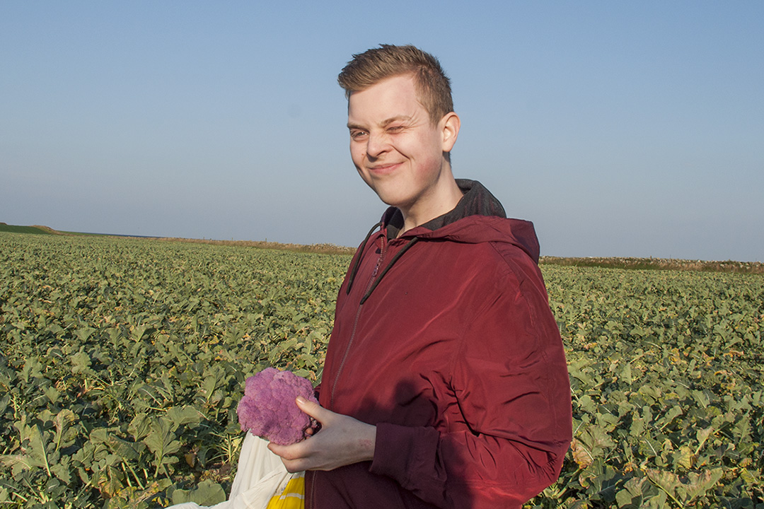 – Det er kjekt å koma seg ut av klasserommet og sjå korleis det er i råvarelivet, seier han, og nyttar høvet til å hausta lilla blomkål.