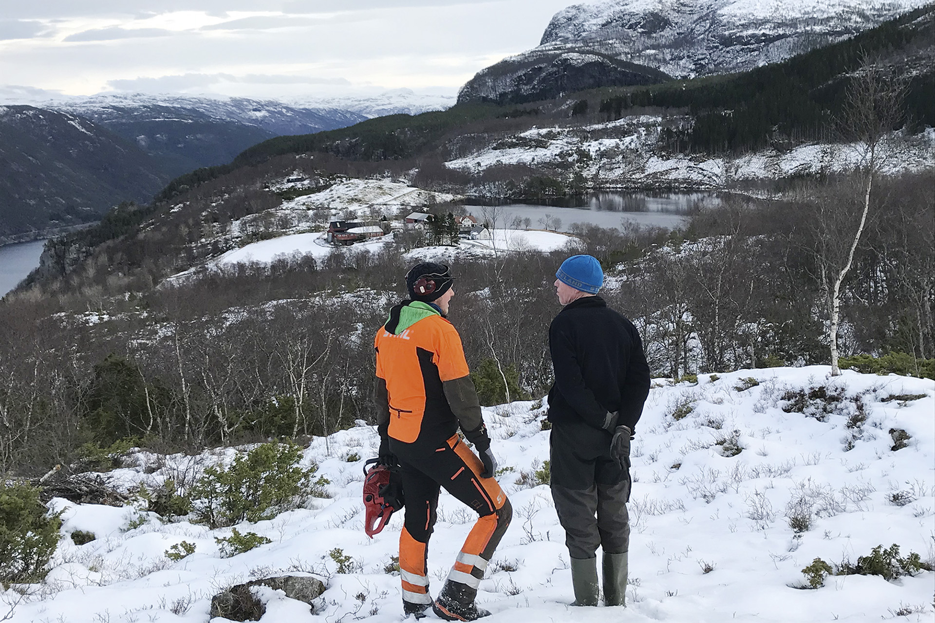 Hogst: Her er far og sønn ute og hogger fåretrær. I bakgrunnen ser vi gardstunet. (F.v.) Ola S. Hagalid og Jone Hagalid. Foto: Hanne Sundbø