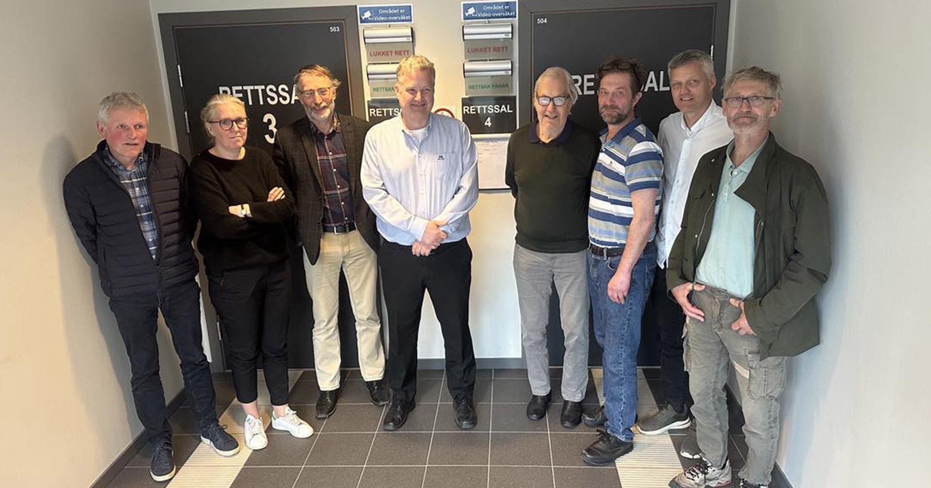 I kampen om areala: Dei sju saksøkte – og nå frifunne – grunneigarane frå Njå, Netland, Kverneland, Frøyland og Kalberg framfor rettssal 3 i Sør-Rogaland tingrett i førre veke. Frå venstre, Lars Nedrebø, Kirsten Kverneland, Andreas Aarsland, Betuel Frøyland, Tønnes G. Kverneland (far til Kirsten Kverneland, som òg driv gard i området), Olav Aarsland, Bjørn Lende og Ingvar Søyland.