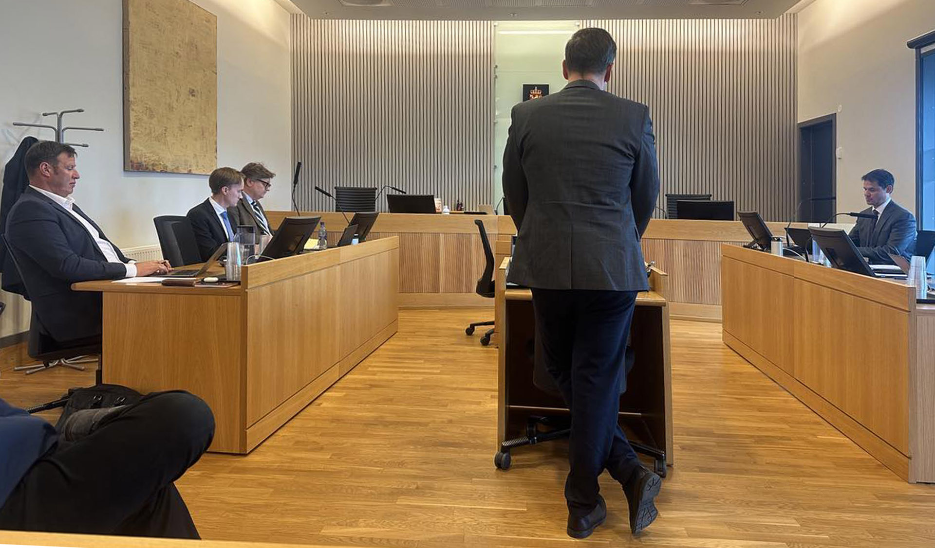 Til venstre i salen, representert av advokat Olav Todnem og advokatfullmektig Daniel Røvik frå CMS Kluge, sit Tom Tvedt. Kledd i mørkeblå dress er han dagleg leiar i Time Energipark AS (heretter TE).
