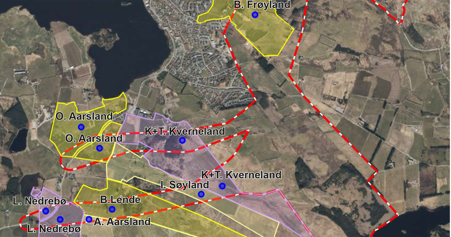Historisk jordbruksland: Den raude streken markerer grensene for områda kor Time kommune ønskjer kraftkrevjande industri om omkøyringsveg. Eigedommane til grunneigarane som motset seg grunnundersøkingar, er markert med namn og blå kuler. Dei farga områda viser eigedommane. Illustrasjon: Hilde Frøyland