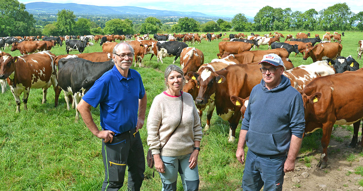 Heier på Tine: - Jeg tror det finnes en stor mulighet for å selge Jarlsbergost over hele verden. For å lykkes er det nødvendig å tenke stort, langsiktig og ambisiøst, sier Tom Dunne (t.h), her sammen med de norske bøndene Olaug og Svein Knut Lie, samt noen av de 400 NRF-kyrne sine.
