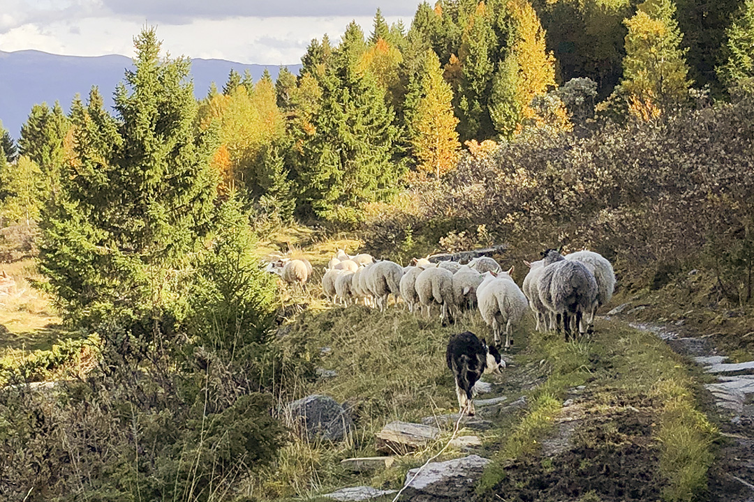 Sanking: Frå sauesankinga i Gudbrandsdalen hausten 2018. – Eit fantastisk område, seier rogalendingen. Hunden, Trixi, har full kontroll på flokken. Foto: Nils Ørjan Hamre.