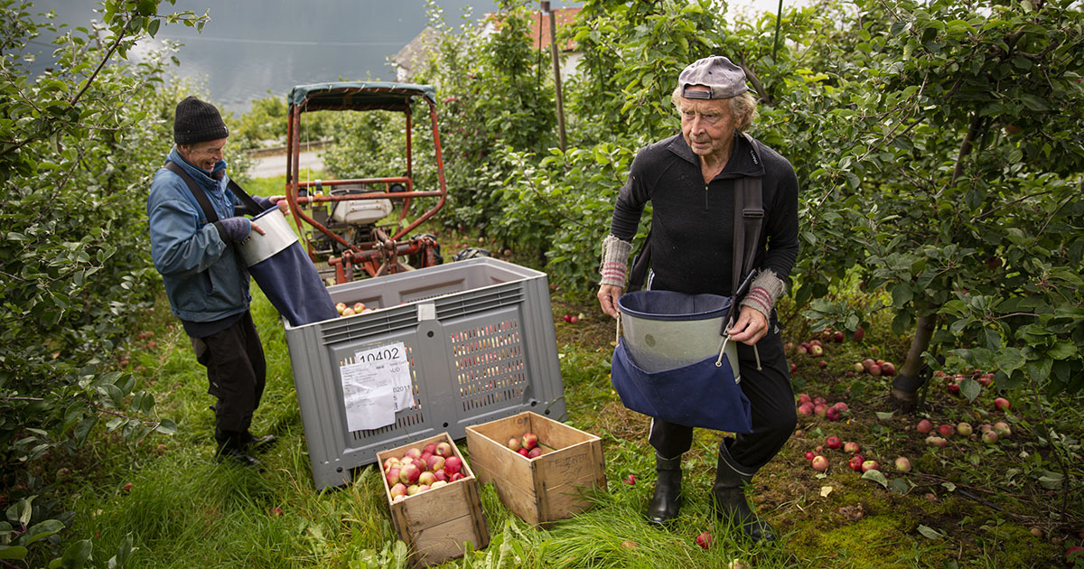 I dag plukkar dei raud aroma på garden Haustveit på vestsida av Sørfjorden i Hardanger. Tåkedottane sig oppover i fjellsidene, sola kjem fram og får eplene til å skina enno meir.