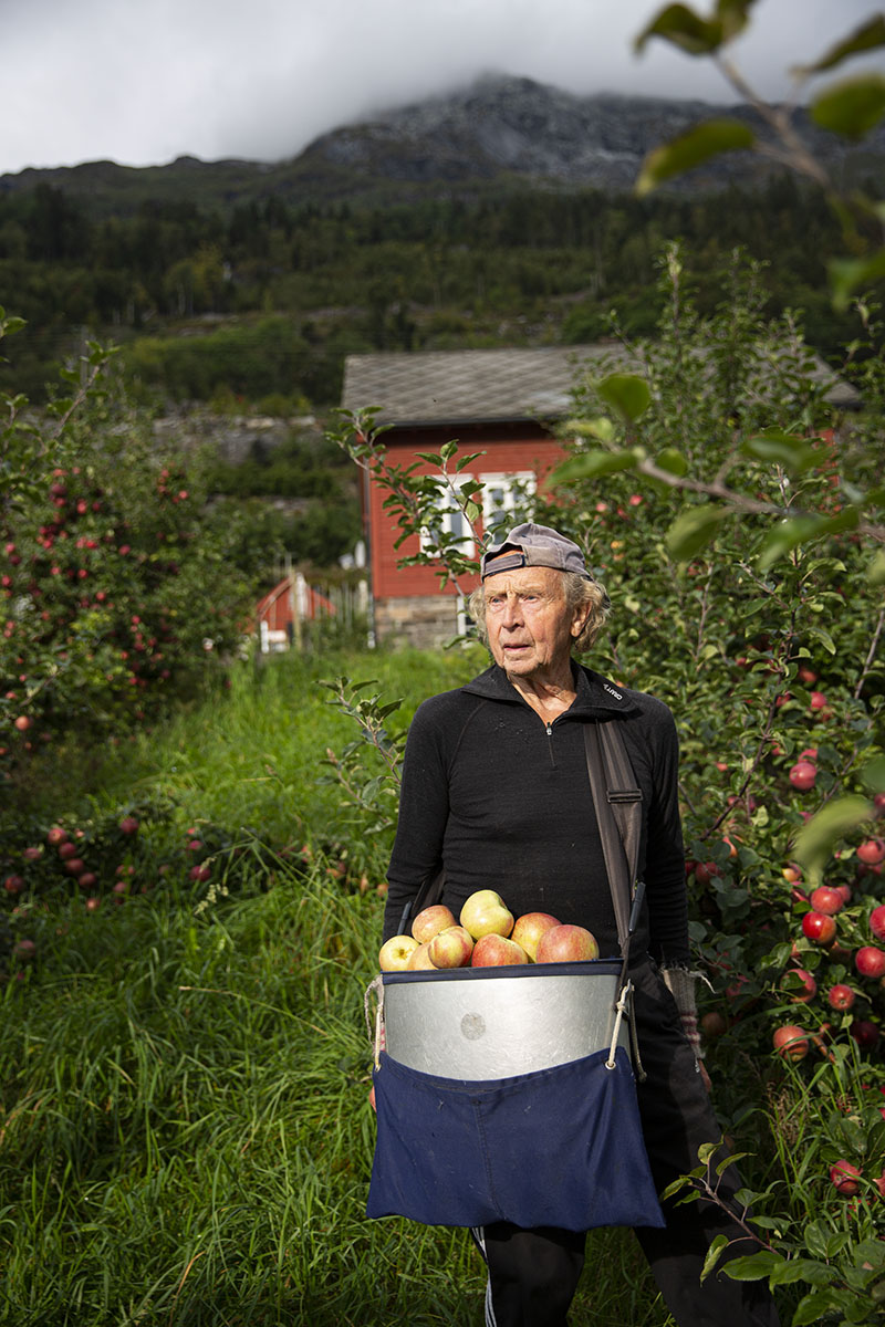Seks år gamal vart Torstein Haustveit sett i arbeid heime i eplehagane. 80 år seinare står han her framleis og pitlar eple.