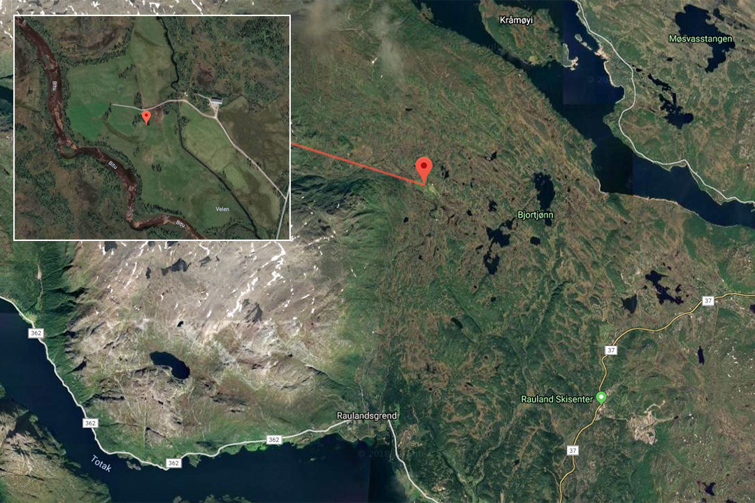 Høgt til fjells: Setra ligg på 920 m.o.h., omtrentleg midt mellom Møsvatn og Totak. Skjermdump frå Google maps.