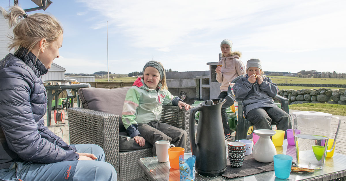 På terrassen er det saft og lappar å få, og tid til spørsmål. F.v. Tonje, Katrine, Mathilde (bak) og Siri.