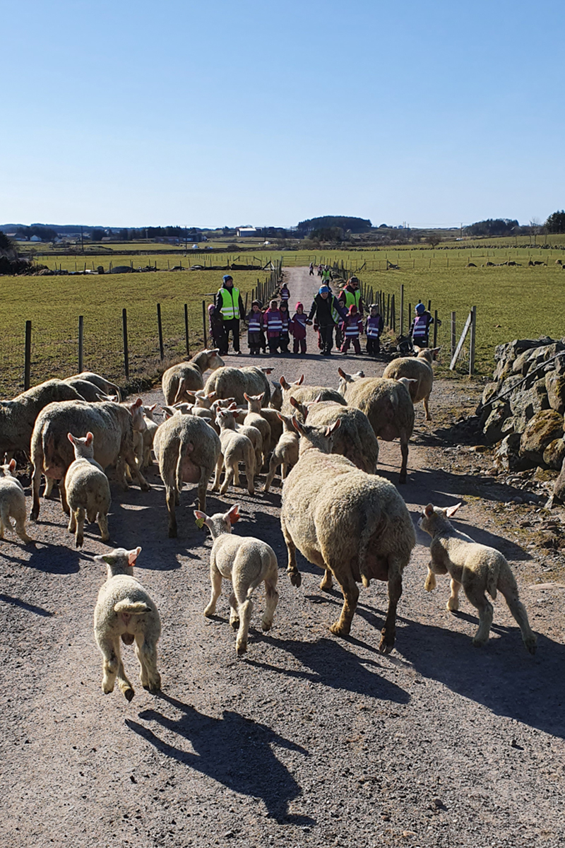 Barnehagen danna eit levande gjerde då saueflokken med lam skulle ut første gong.