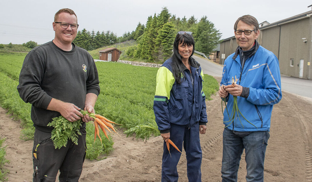 På Bru gard på Brusand i Hå er gulrøtene ei veke forseinka, jamført med skjema. Men i det siste har veksten vore god. Sesongens gulrøter er på veg til butikkane.