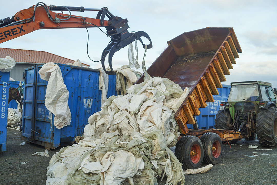 Det er laurdagsfred på Bjorhaugsletta industriområde på Nærbø. Men ikkje heilt. Første laurdagen i desember kjem det traktorar med tilhengarar i alle fargar og fasongar glidande inn mot industritomta. Her herskar det organisert kaos eit par føremiddagstimar. Bøndene riggar seg til i ein kø, og ventar på å få rygge ekvipasjane på plass mellom fire blå containerar, der to gravemaskinar med høvelege klyper står klar til å heise dryge fang med plast høgt til vêrs og over i conteinerane.