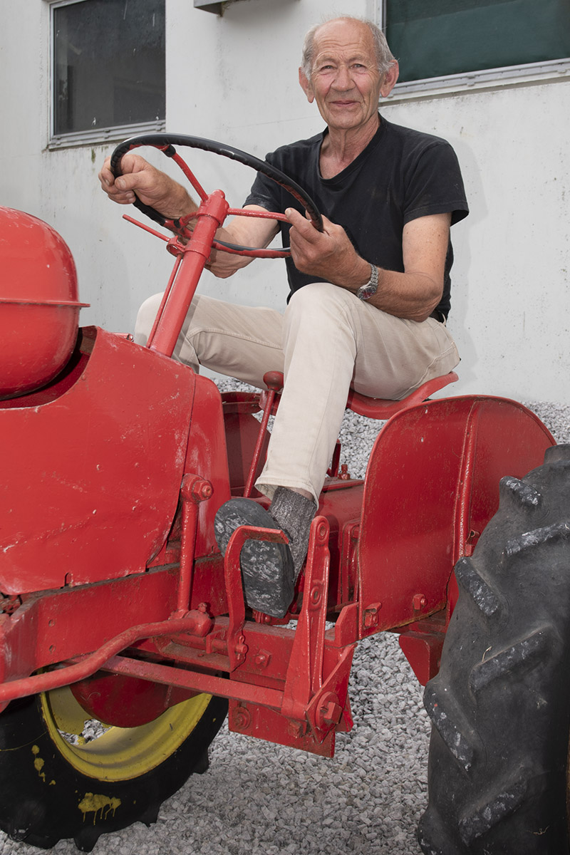 To veteranar: Harald Odland var servicemann for Felleskjøpet i pionertida midt på 70-talet. Her sit han på ein av dei to veterantraktorane han har utstilt heime på tunet på Odland i Hå.