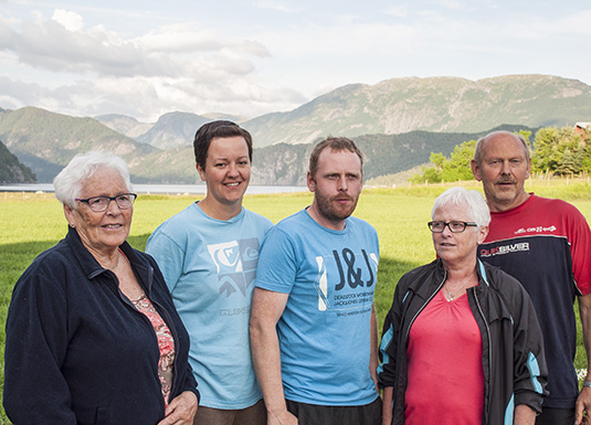 Tre generasjonar bønder. Frå venstre: Bjørg Valheim (farmor til Sven Magne), Birgit og Sven Magne Valheim, og Solveig og Sven Valheim (Foreldra til Sven Magne).