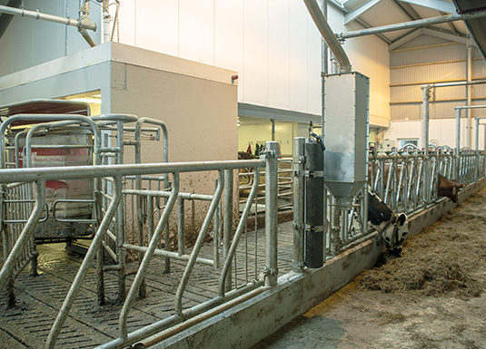 Grovfôret blir servert på band, fôrbrettet har vidde nok til traktor, 2,70 meter – med port i kvar ende. Kyrne har eiga dør med utgang til beite på baksida av fjøset. Kalvane startar livet utandørs. Kalvahyttene har fått plass under eit overbygg, godt beskytta mot vêr og vind.