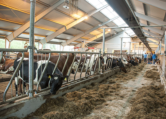 Fjøset har naturleg ventilasjon og automatisk fôring. Mjølkekyr og gjeldkyr til venstre for fôrbrettet. Ungdyr på andre sida.
