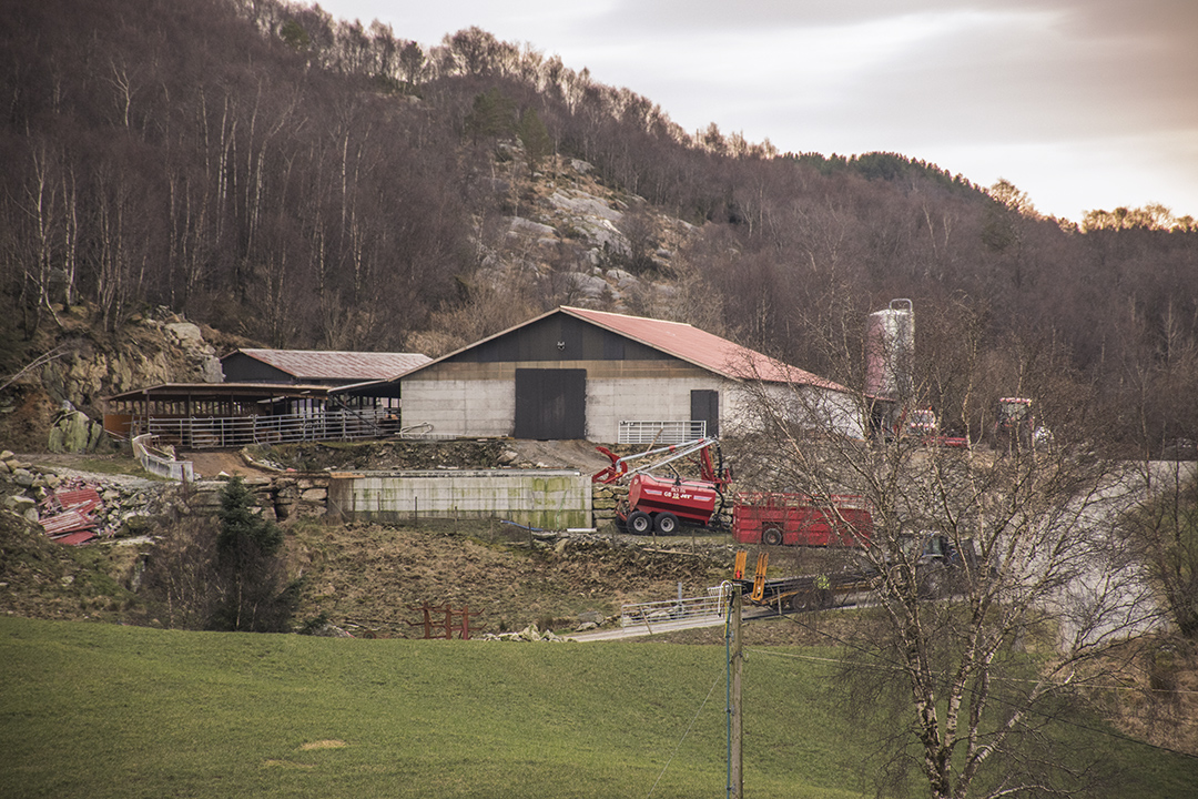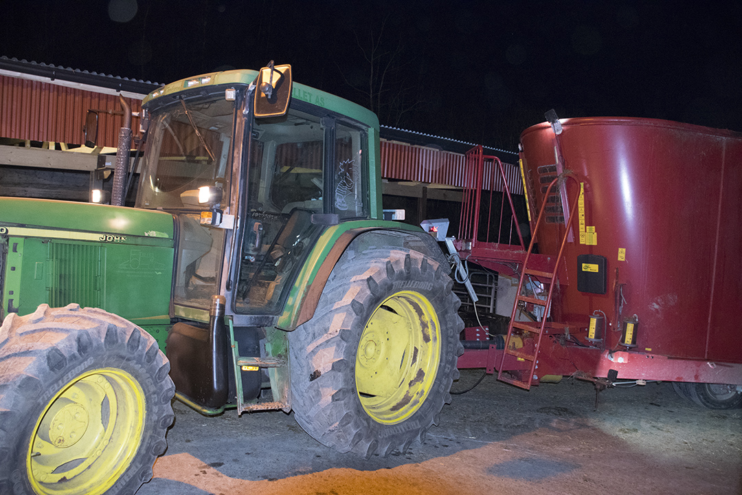 Med fullfôrvogna får dei blanda grovfôret. Ei blanding på 2000 kg består av første og andre slått, 200 kg tørr halm og litt mineral. Gjødsla vert tørrare og båsane reinare med litt halm i blandinga, er bøndene si erfaring. Blandinga rekk eit døgn, med utfôring kvar ettermiddag.