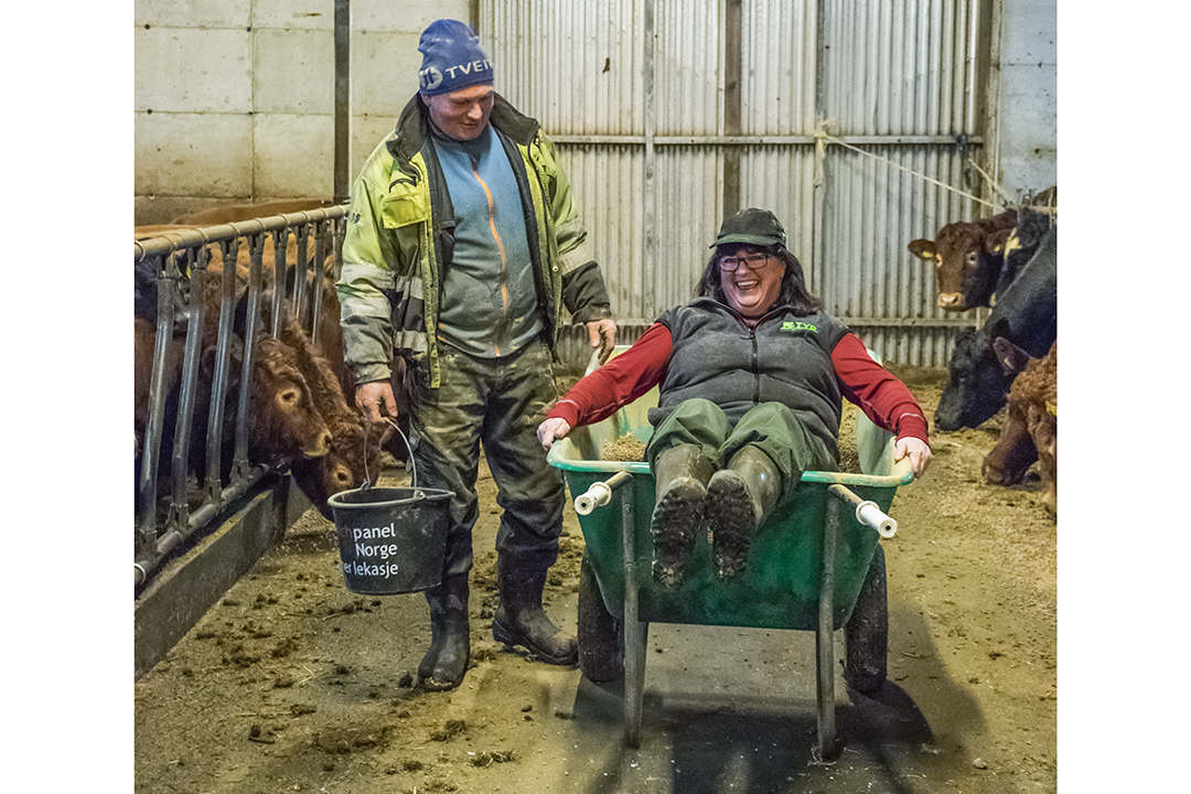 Knut Egil er bonde på fulltid, etter mange år som maskinentreprenør. Inger Johanne har full stilling som seniorkompetanserådgivar i AOF Haugaland. Men ho innrømmer at det er godt å koma heim til praktisk arbeid på garden, etter ein hektisk kontordag.