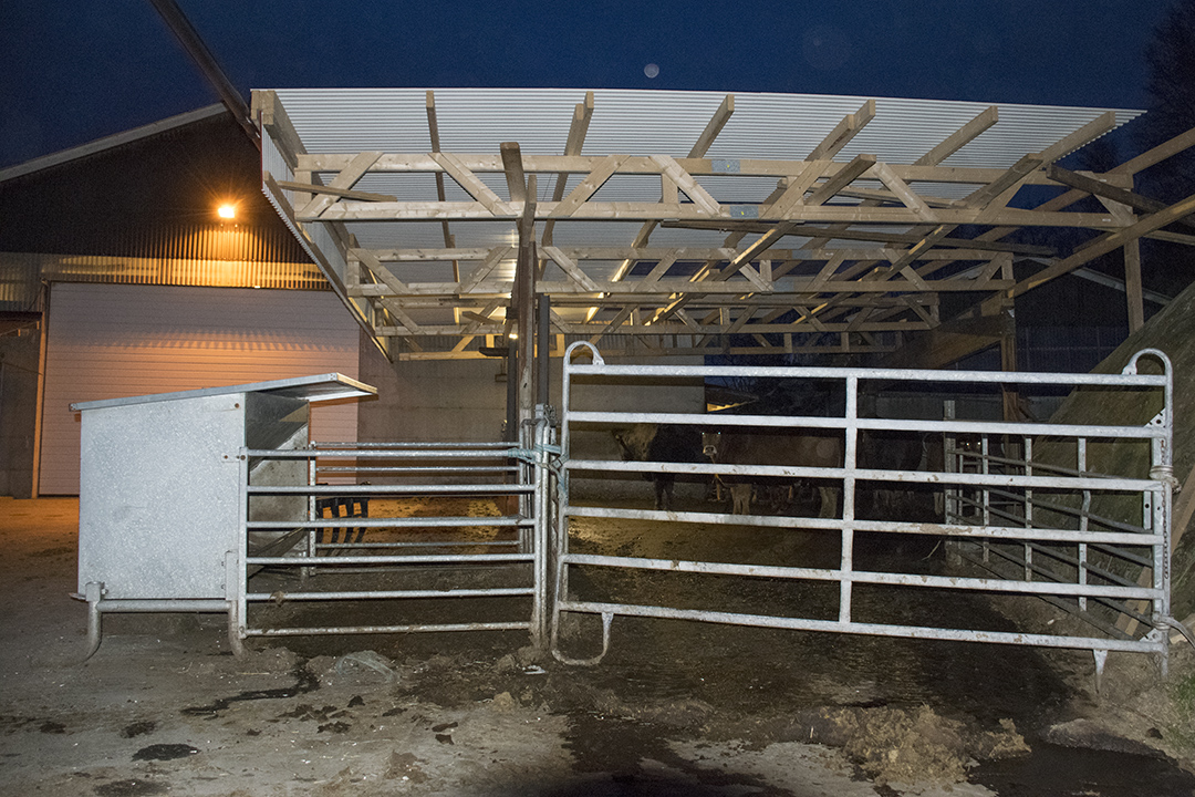 Alle dyra har tilgang til uteareal med støypt dekke og liggeplassar. Med opning i begge endar kan dei ulike gruppene gå ut og inn som dei vil heile året. Fjøset er plassert ved ein fjellskråning, og Knut Egil har støypt liggebåsar under halvtak, som føl fjellskråninga i ei bue. Langs fjøsveggen er det liggeplatting med gummimatte.