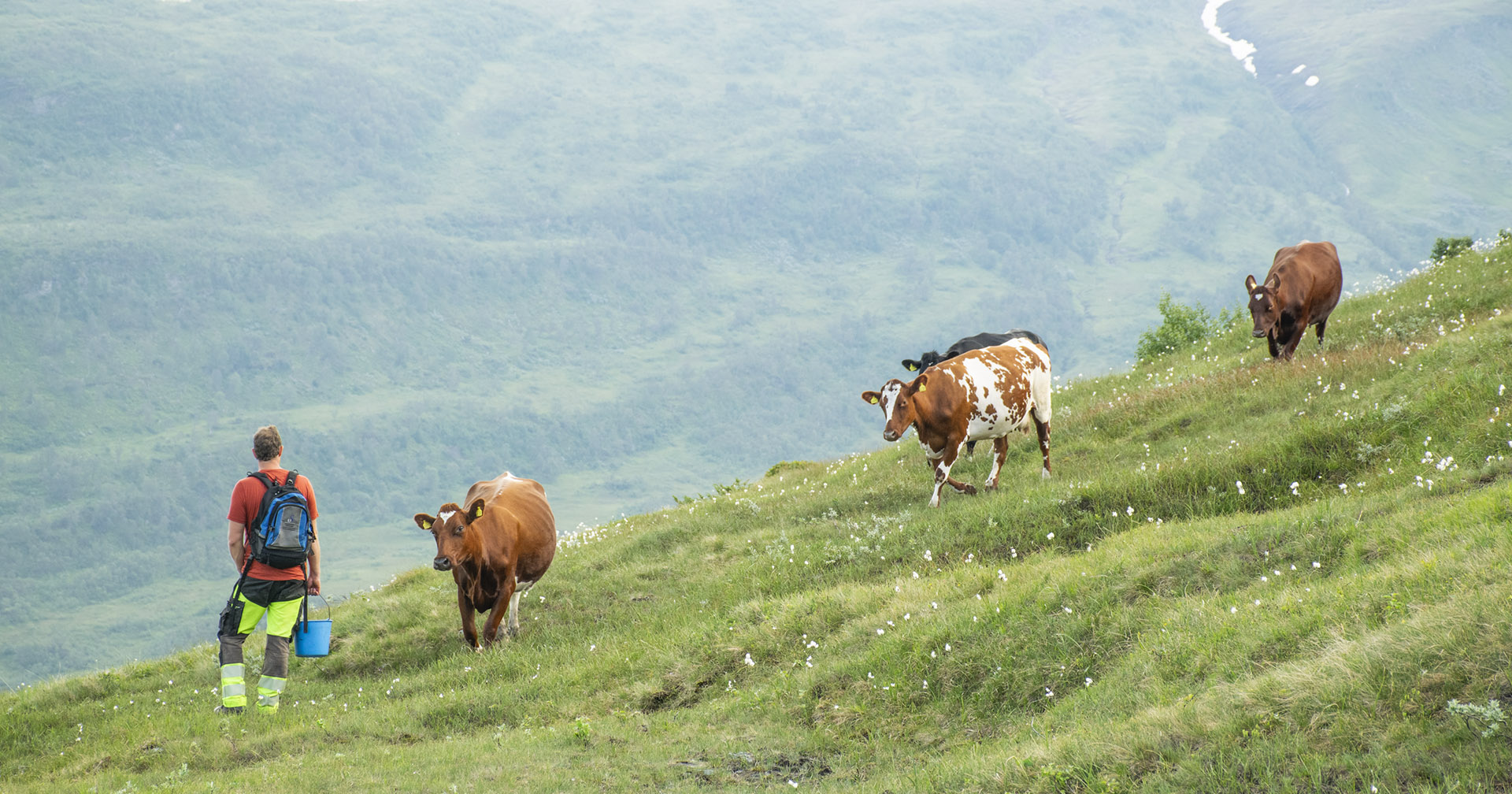 Sjølvforsynt i 2050: Skal norsk matproduksjon bli meir robust og sjølvforsynt, må vi snu om på tankegangen. Meir mjølk må vike for målet om å bruke dei norske fôrressursane på ein betre måte, meiner forskar Laila Aass ved NMBU. Illustrasjonsfoto: Mjølkekyr på frodig fjellbeite frå Vik i Sogn.