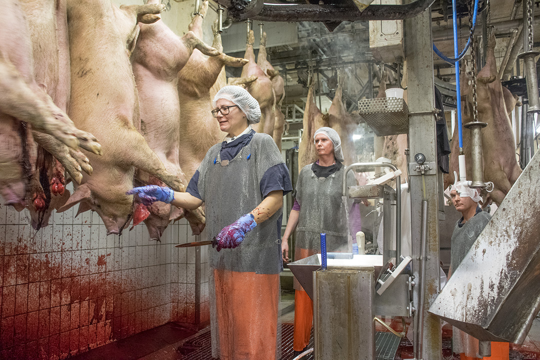 Ein føremiddag på slaktelinja hjå Nortura på Forus. Kursdeltakarane er kledd og skodd og utstyrt med stikkekniv. Dei ventar på gris som nett er avliva.
