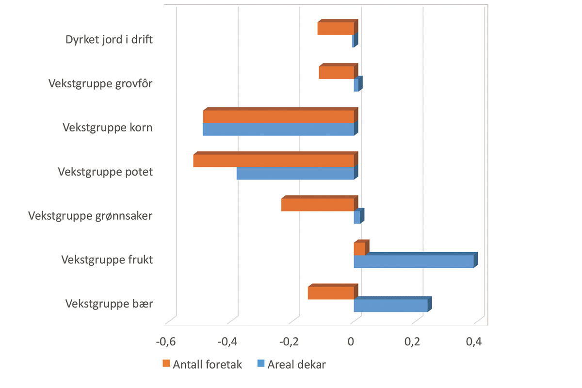 Frukt og bær: Dyrking av frukt og bær har vakse formidabelt i Rogaland dei siste ni åra, med høvesvis 39 og 24 prosent. Talet på bærdyrkarar er redusert med 15 prosent, medan det er fire prosent fleire som dyrkar frukt.