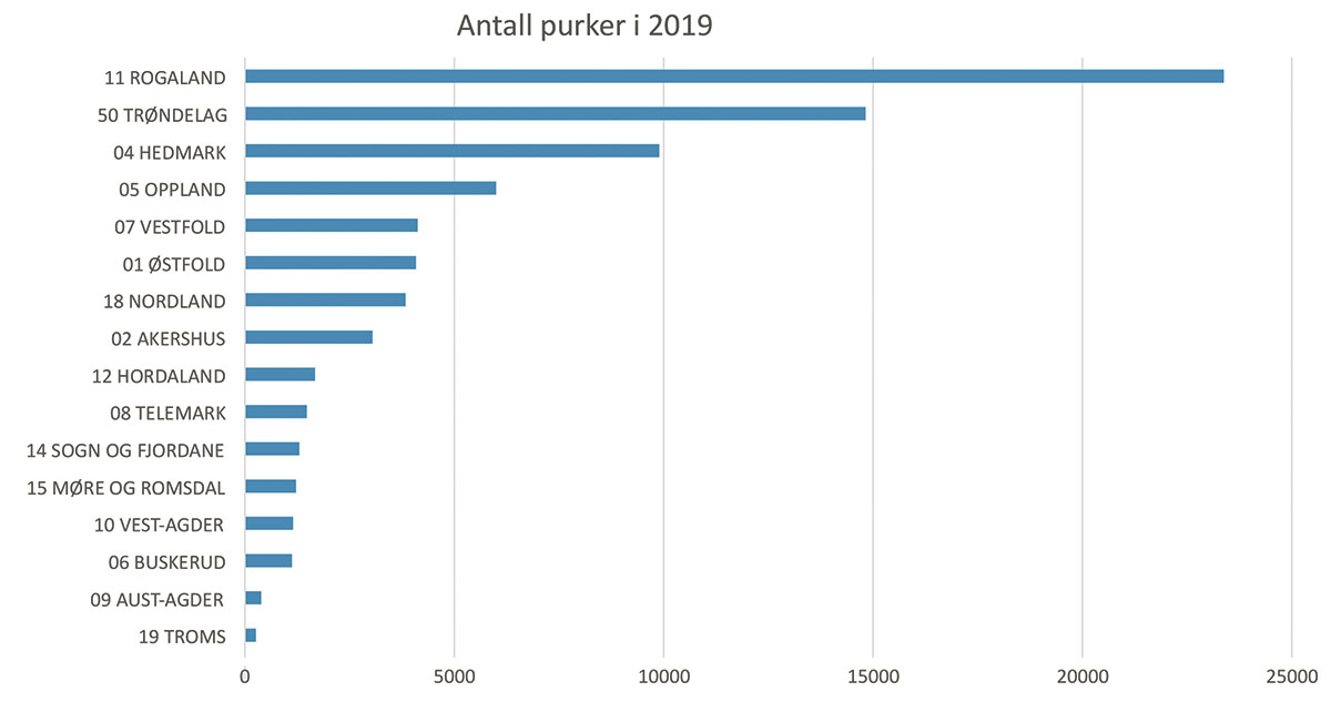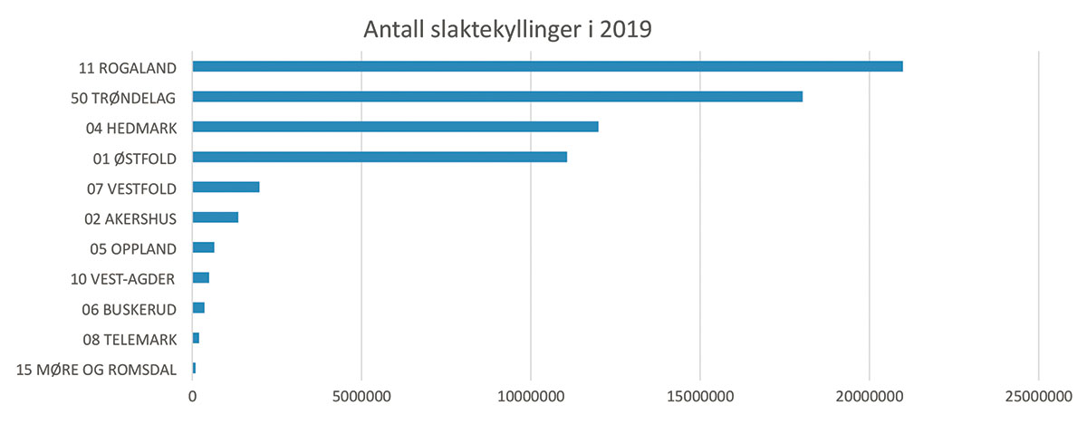 Purker og slaktekylling: Rogaland hadde 22 prosent av purkene i Norge i år 2000. Nitten år seinare har fylket hand om nær kvar tredje purke. Rogaland hadde 15 prosent av slaktekyllingproduksjonen i 2000. I 2019 er Rogaland desidert størst også her, med 31 prosent.