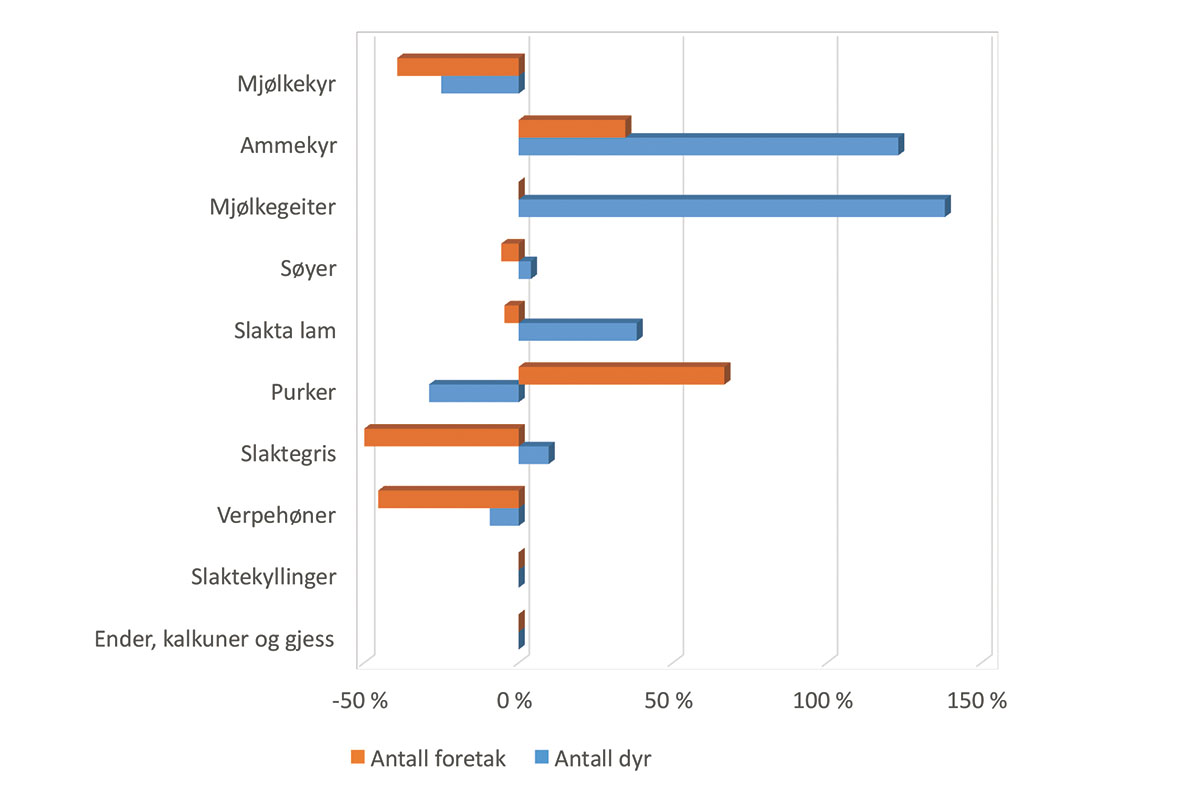 Mjølk: Frå statistikken i Suldal kommune. I 2010 hadde kommunen 61 føretak med mjølkeproduksjon. I 2019 er talet redusert til 37, ein reduksjon på 39 prosent. Talet på mjølkekyr er redusert med 25 prosent i same perioden. Grafen synar ein betydeleg auke i talet på føretak med ammekyr. To produsentar dreiv med mjølkegeit både i 2010 og 2019. Dei to har auka talet på geiter monaleg.