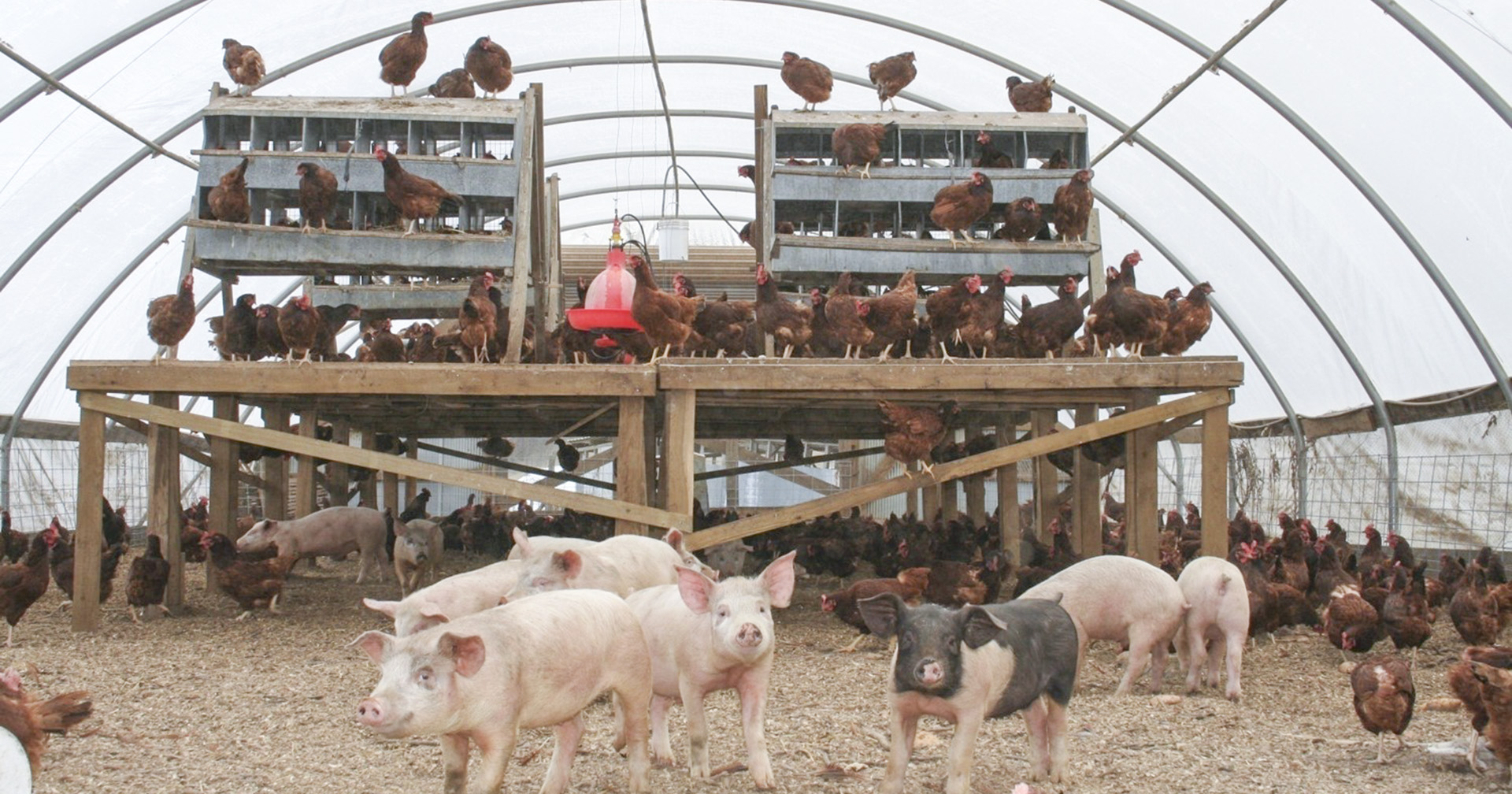 Fjøs…: Når det blir kaldt trekk høns, grisar og kaninar inn i polytunnellane på garden. Kaninane øvst i bur, hønene i midten og overalt, grisane på bakken. Salatin er ikkje uroa for smitte. Når så mange ulike dyreslag bur i lag, blir patogenane svært forvirra, hevdar han.