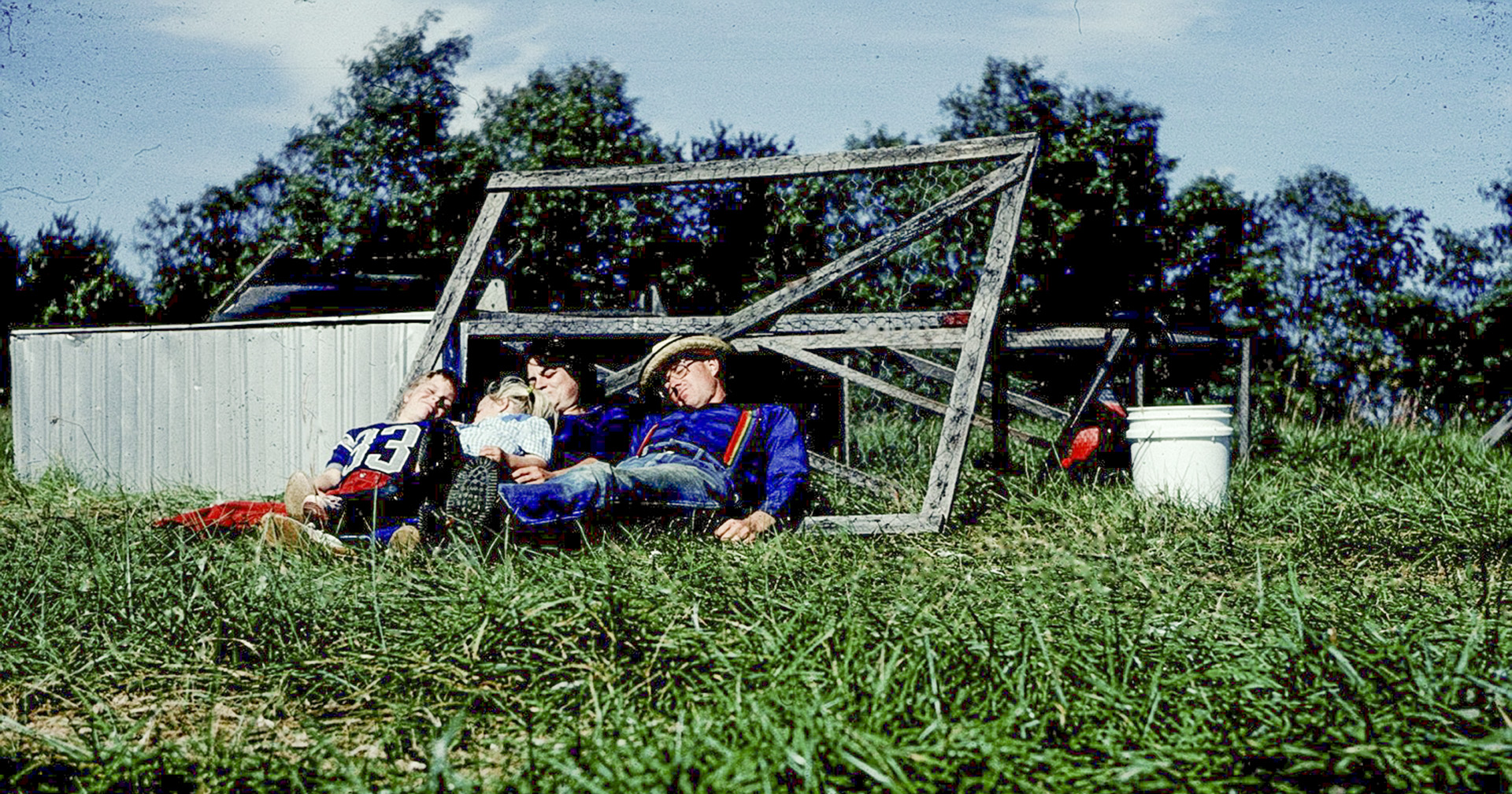 Det viktigaste: Før me har greidd å skapa ein stad som ungane vil koma attende til når dei er tenåringar, har me ingenting, meiner Joel Salatin. Her under ei freda stund med kone og barn for mange år sidan. Sonen driv Polyface farm i dag.