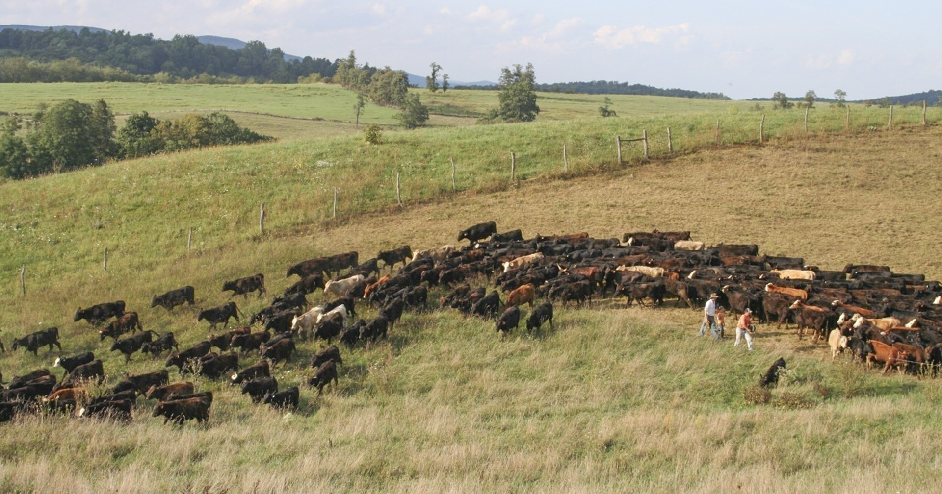 Beitebruk: Dei tusen storfea på Polyface farm, Virginia, beiter etter mønster frå dei enorme bøffelflokkane på prærien. Garden får ca 800 mm regn i året og er frostfri frå midten av mai til midten av september.