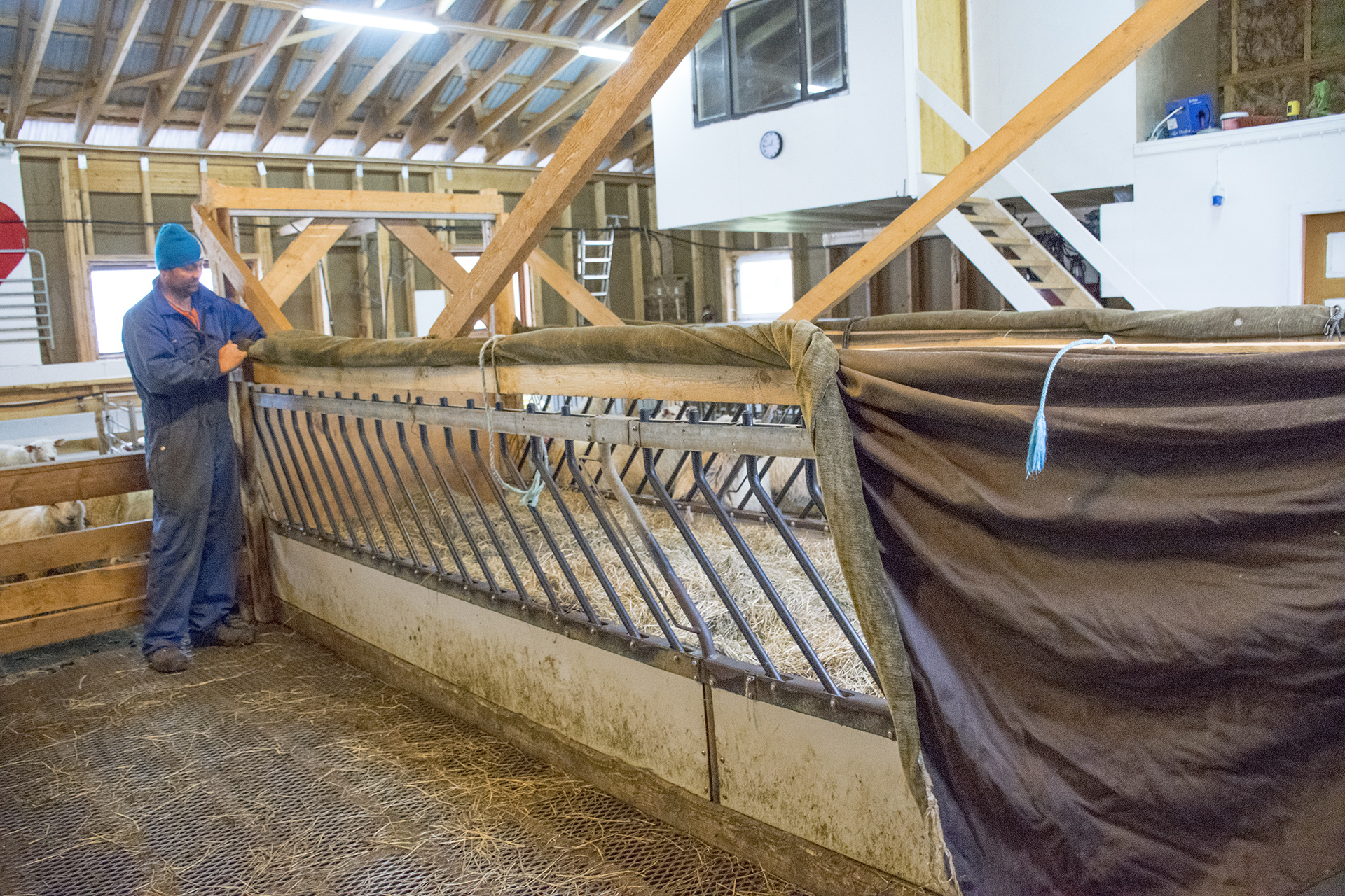 Bortsett frå frontane, er dei to Islandshekkane heimesnekra. Flata på 5×1,5 meter rommar tre rundballar, som vert plassert med  traktor frå utsida gjennom høge skyveportar. To bingar deler ein fôrhekk. Fronten kan skyvast inn mot midten av fôrbrettet slik at sauene alltid kan nå fôret. Kraftfôrtildelinga skjer individuelt frå kraftfôrautomatar.