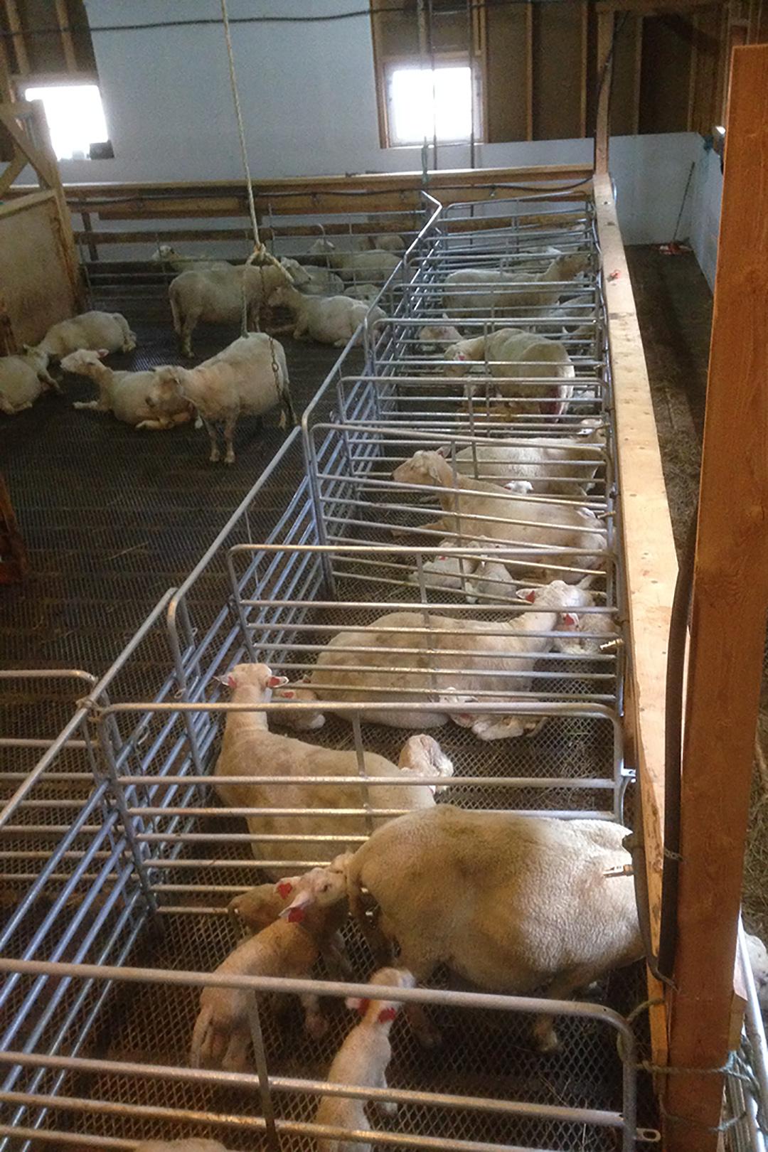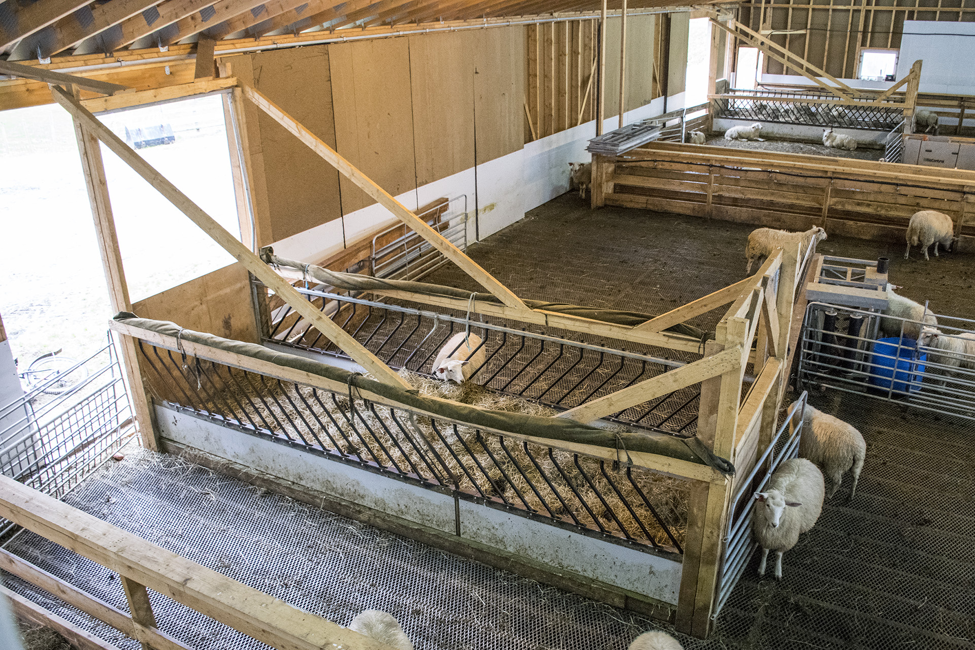 Med lettgrinder kan dei dele av inntil førti lammingsbingar. Drikkeniplar er montert for kvar meter langs fronten, slik at alle  lammingsbingane har tilgang til temperert vatn.