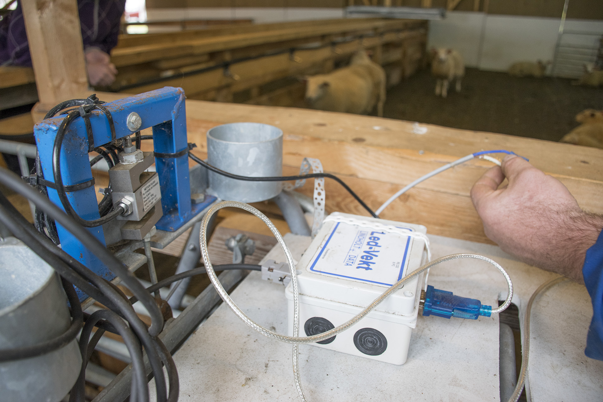 Johan har bygd om vekta og montert på ei Led-vekt frå Lindholt data. Elektronikkboksen overfører data direkte til sauekontrollen.