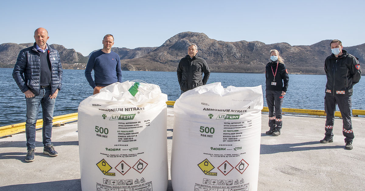 Snart slutt: Når restlageret er selt, blir det heller ikkje i Rogaland og Agder lenger råd å få tak i AN-gjødsel der meir enn 28 prosent av nitrogenet er i form av ammoniumnitrat. Frå venstre: Arne Stangeland, Gjødsel AS, Oddbjørn Lobekk, Fiskå Mølle, Jens Randby, FKRA, og Gunvor Hoff og Kenneth Vik frå Rogaland brann og redning IKS.