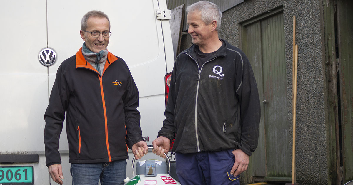 Påfyll: Harald Kolstad leverer påfyll av oksesæd til ein av dei faste kundane på Jæren, Varhaug-bonden Halvor Egeland.