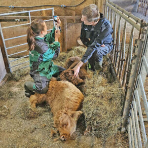 Feltarbeid: Komande dyrlege Helene Fuglesang Svensen ute i praksis. Her er det førebuing til avhorning av kalvane til Ole Reidar Skailand. Foto: Ole Reidar Skailand.