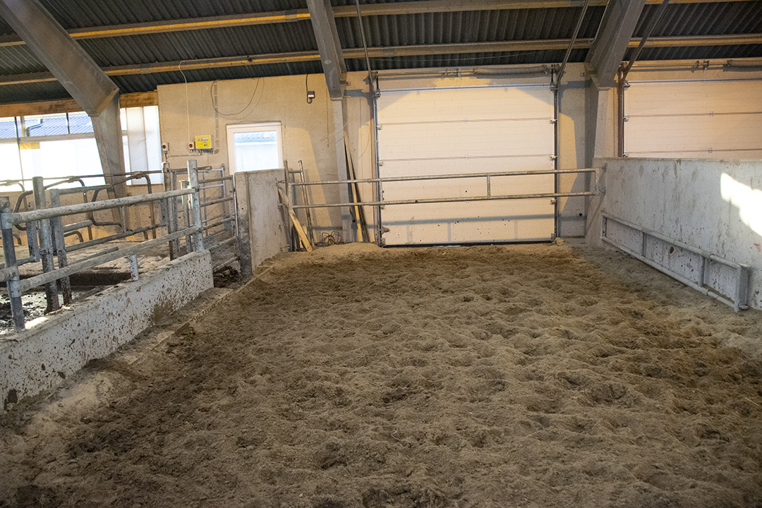 Den digre kalvingsbingen er fylt med sand. Etter kalving får kalven ein enkeltboks, medan kua vert flytta dei få metrane til robotfjøset.