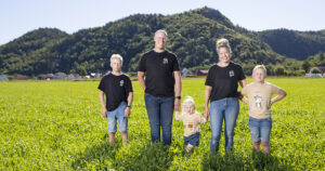 Familien Nystøl Simonsen: Frå venstre: Brage Tobias, Simon André, Lea Marie, Jannike og Isak André. Jannike er styremedlem i Felleskjøpet Rogaland Agder. Foto: Privat.