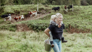 Lindesnes gard: Jannike Nystøl Simonsen med kraftfôrbøtta og dottera Lea Marie på ryggen og ungdyra hakk i hel. Foto: Privat.