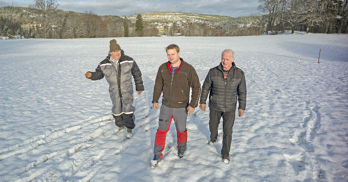 Ei endring: Kampen for Egsjordet er blitt eit symbol på endring i Kristiansand. Endeleg er jordvern tydeleg på den politiske agendaen. Her er bonde Magne Thorvald Bakken (t.v.) og leiar i Bondelaget i Kristiansand, Gunnar Hangeland (t.h.), saman med Knut Erik Ulltveit, leiar i Agder Bondelag, på Egsjordet ein vinterdag. Foto: Kjartan Bjelland