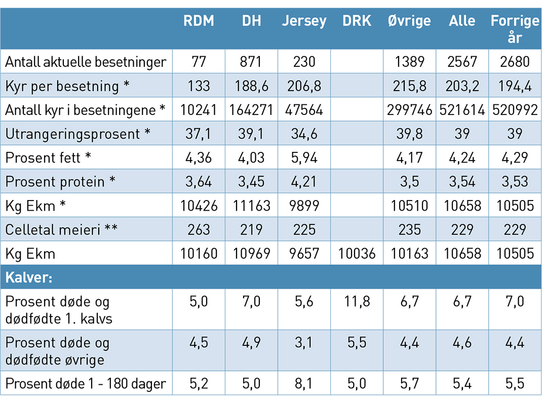 Nøkkeltall: Tall fra Resultat og Ydelseskontrollen RYK, per august 2018. RYK omfatter 87 prosent av danske melkeprodusenter. RDM=rød dansk melkekvæg, DH=dansk holstein, DRK=dansk rødbroget kvæg, øvrige=krysning- og blandingsbesetninger.