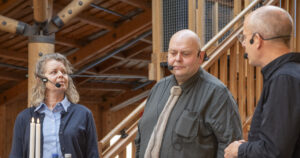 Pelsdyrprat: Forfattar Bjørn Arild Ersland t. h. i samtale med Gunhild Vikeså Sæland og Jan Ove Horpestad.