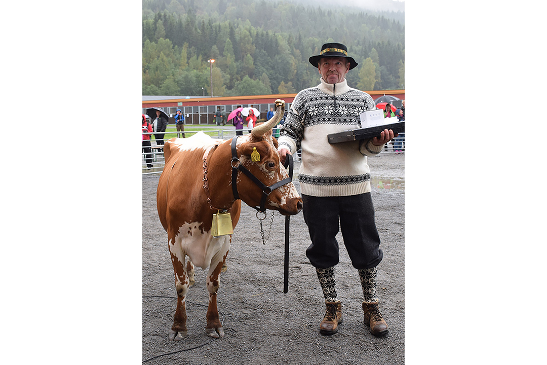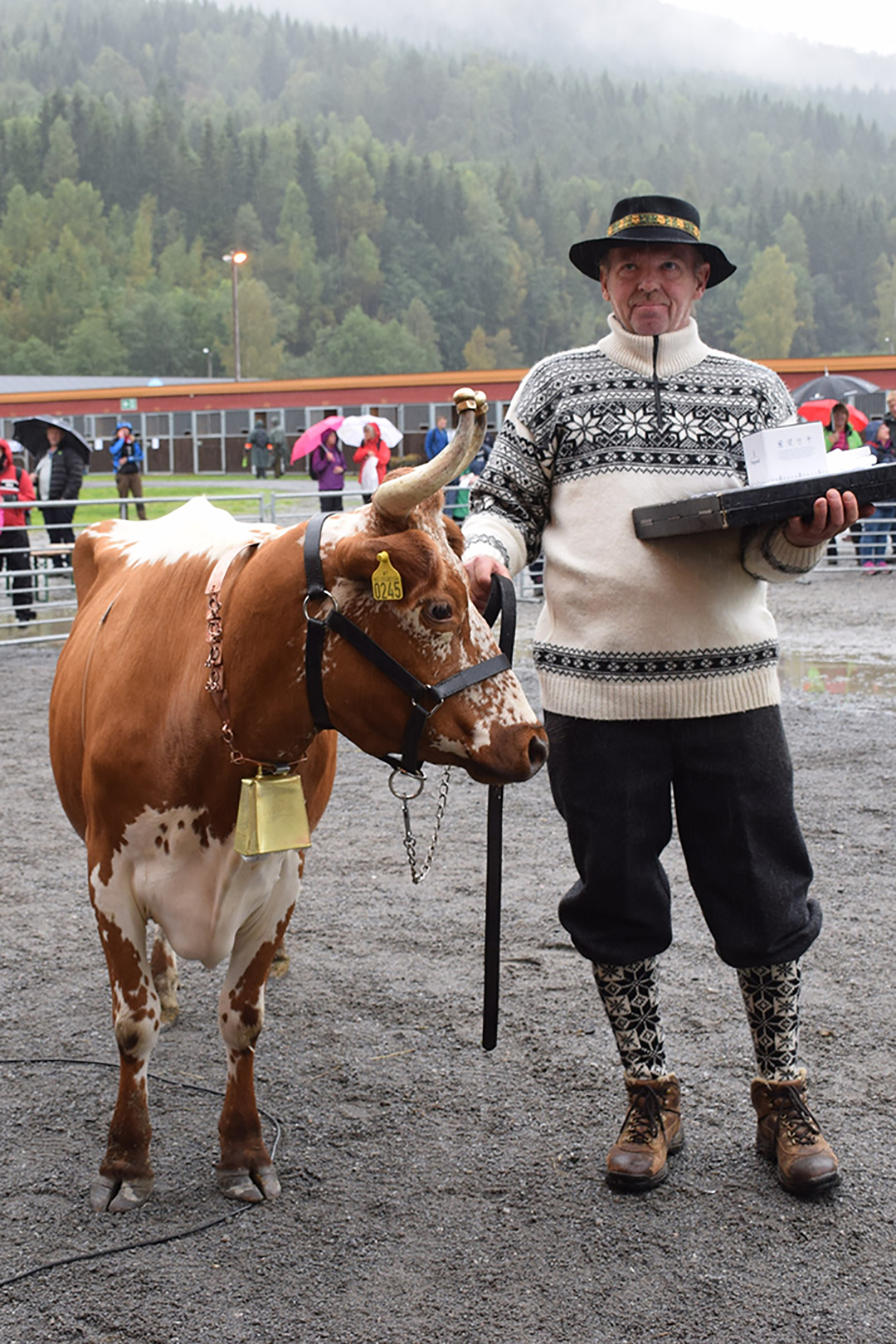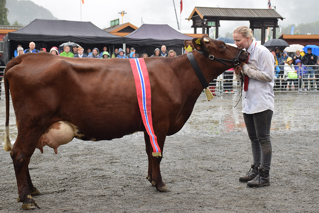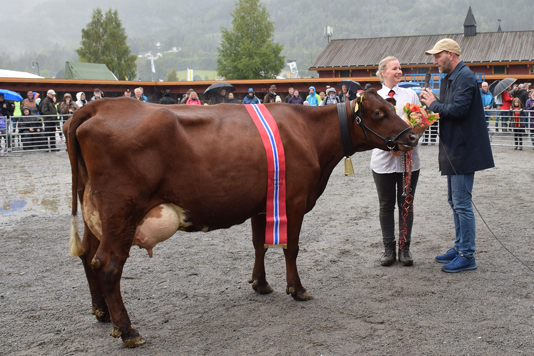 Beste Ku: Tredjekalvskua Maggi frå Kurompa Samdrift i Bø, vart beste NRF med åtte poeng for kropp og 4,5 poeng for jur/ spenar. Far er 10798 Vangen og morfar er 10232 Sand. Maggi fekk tildelt Dyrskuprisen og den ettertrakta Seljordprisen. Mønstrar Silje Hegnastykket, prisutdelar Bård Tufte Johansen.