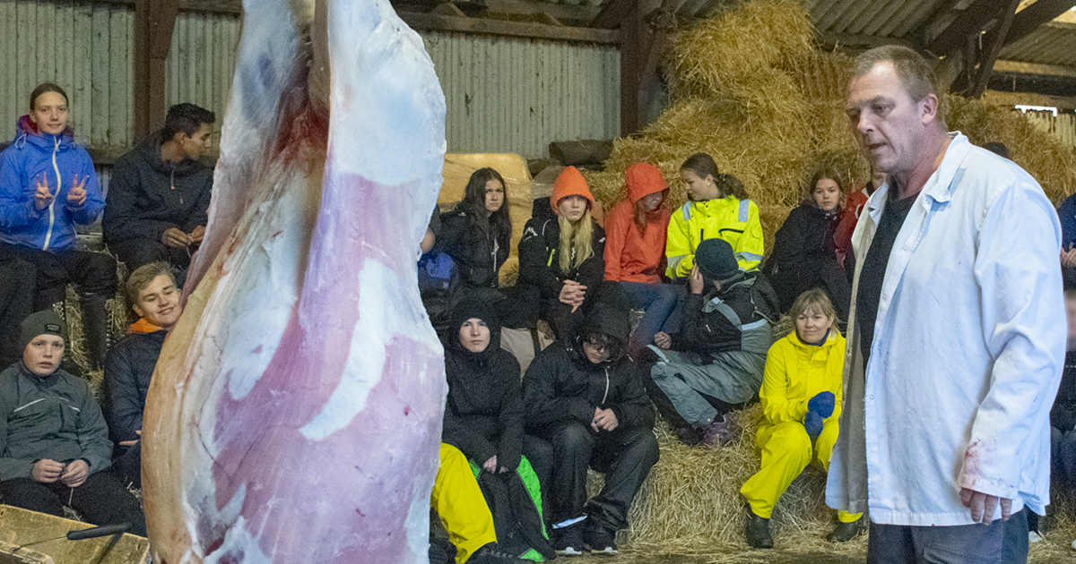 Både bøndene og lærarane har eit godt auge med elevane i tilfellet nokon av dei vil reagere. Med ein skarp kniv og erfarne rørsler skjærer Stian ut den eine stykkingsdelen etter den andre; lår, bog, sadel, rundsteik, surra bogsteik, pinnekjøt, skank og kraftbein. Kjøtet skal bli med elevane attende til skulen slik at dei kan få smake.