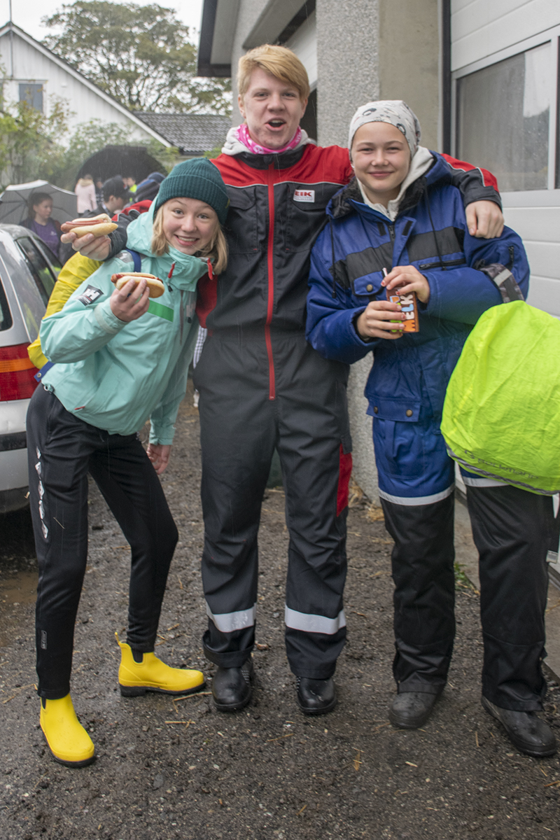 Stas med grilling: Rebecca, Anders Olai og Klara har fått seg grillmat – pølser og burgar frå Nortura – i tilhøyrande brød sponsa frå matbutikkar på Nærbø.