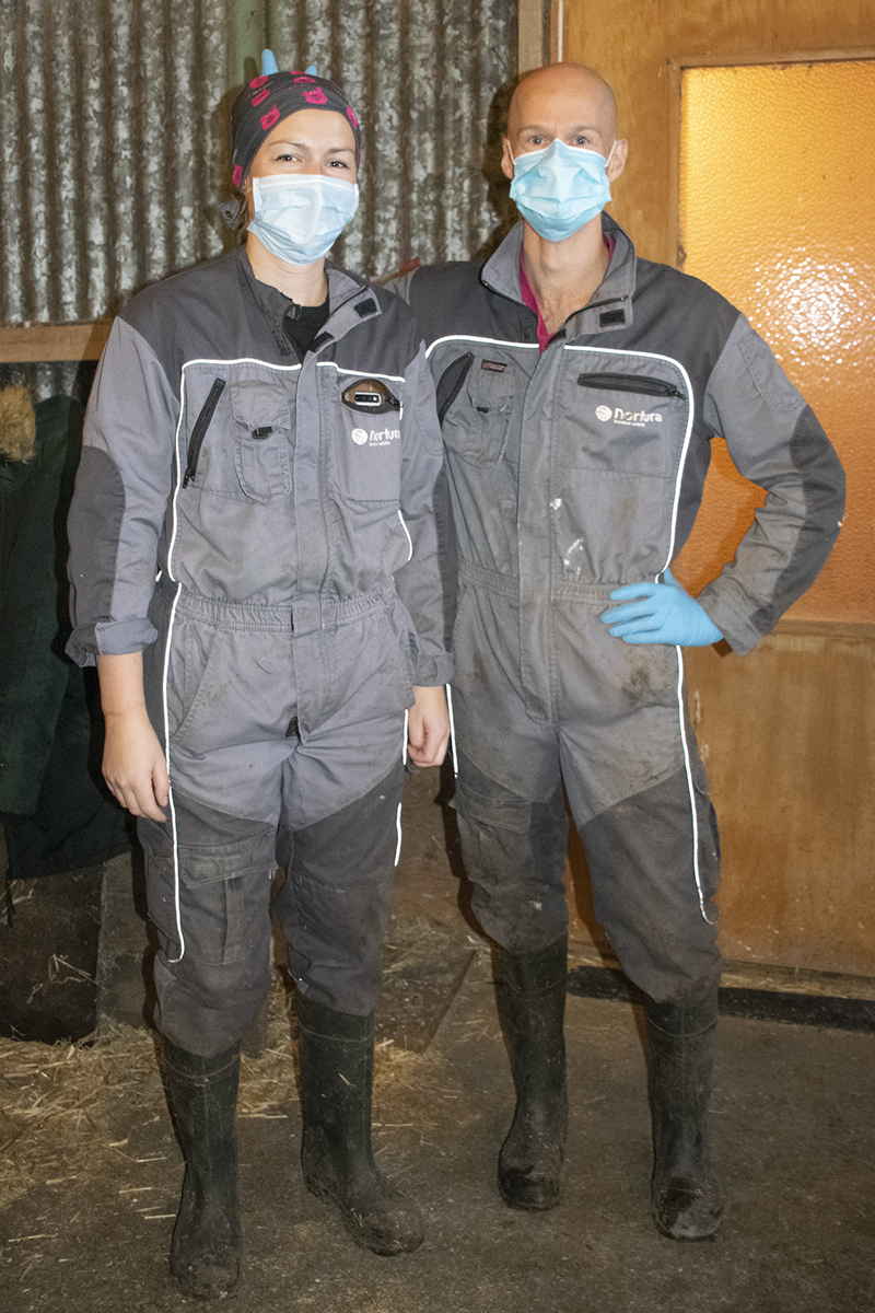 Tonje og Atle har smågrisproduksjon og fôrar i tillegg fram nokre slaktegris sjølve. På låven hjå Tonje og Atle får elevane på seg overtrekksdressar, sko, hanskar og munnbind, før dei vert slusa inn til grisene.