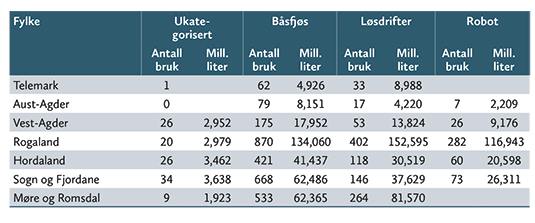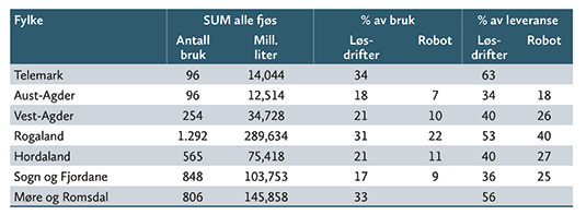 Tabellane viser fordelinga mellom mjølk levert frå båsfjøs og frå lausdriftsfjøs i fylka på Sør- og Vestlandet, målt i antall bruk og i millionar liter mjølk levert frå dei ulike driftsformene.