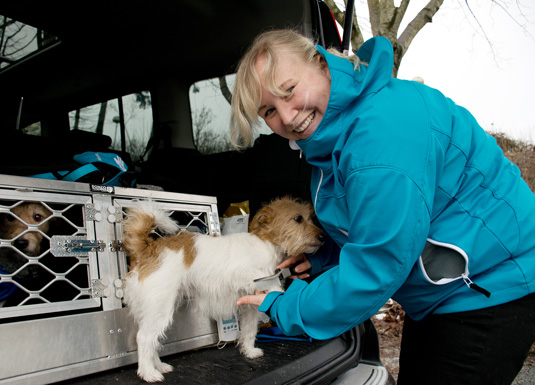 Helle Barstad peker mot et av burene i bagasjerommet. I den romslige bilen gjøres tre hunder klar til dagens arbeid. Hundene bærer navnene Lillegutt, Lucy og Pixel.