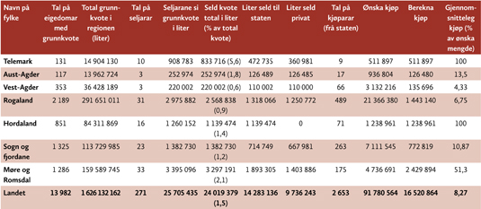Tabellen syner sal av kvote, statlig og privat del, samt ønska og faktisk kjøp av kvote frå staten.