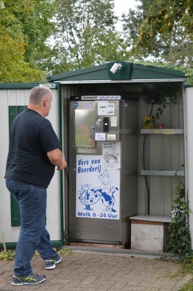 Mjølkeautomat i Nederland. Kunden puttar på pengar og får ut mjølke til eige bruk.