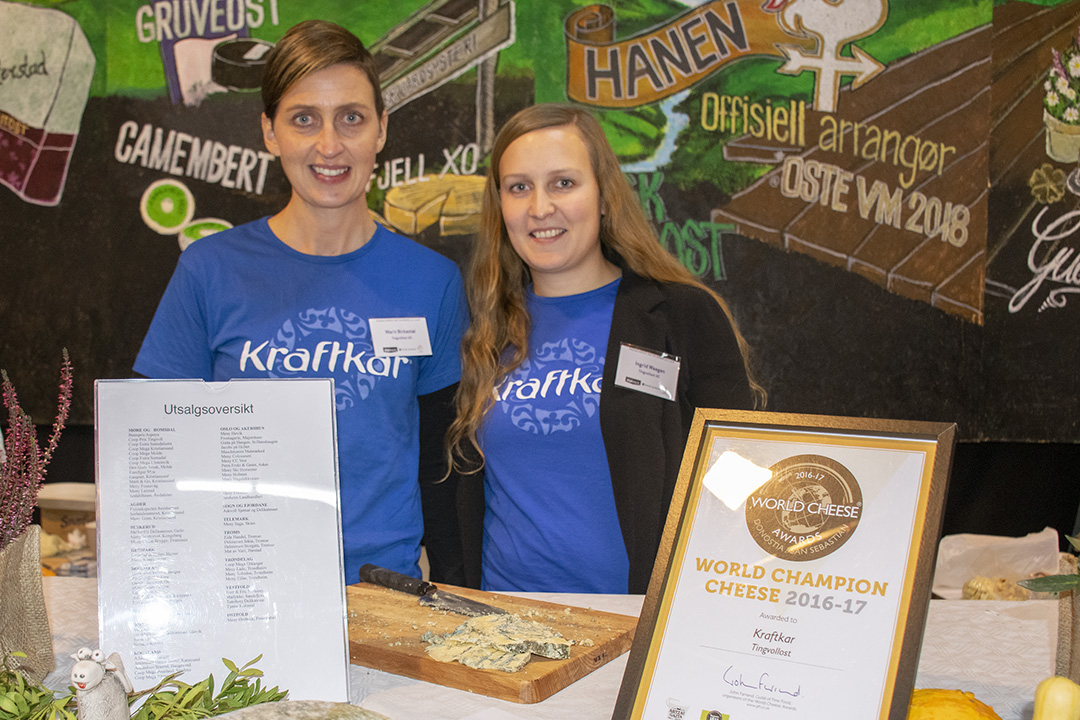 Verdas beste brunost: Barbro Stordalen (t.v.) frå Stordalen gardsbruk, i Tinn i Telemark, imponerte dommarane med sin Heilfeit Brun Geitost. Osten fekk ein delt andreplass og ystaren jubla i lag med Andrea frå Nederland, som er tilsett i drifta.